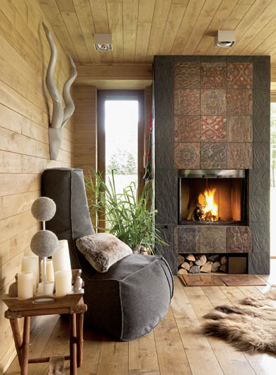 • Meble zrobion z dębowych desek, tak samo jak okładzina na ścianach.