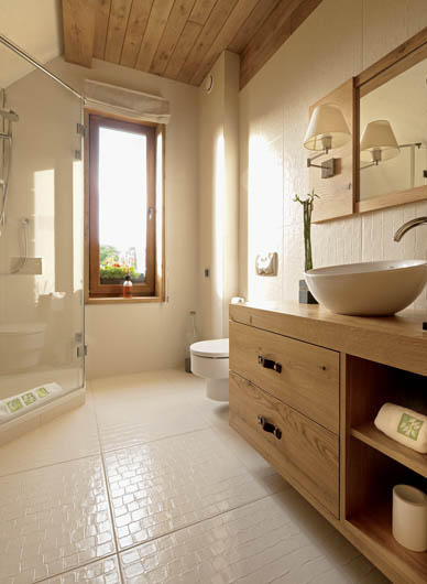 • Drewno tworzy ciepły klimat w łazience.