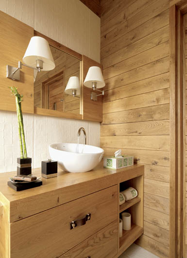 • Meble zrobion z dębowych desek, tak samo jak okładzina na ścianach.