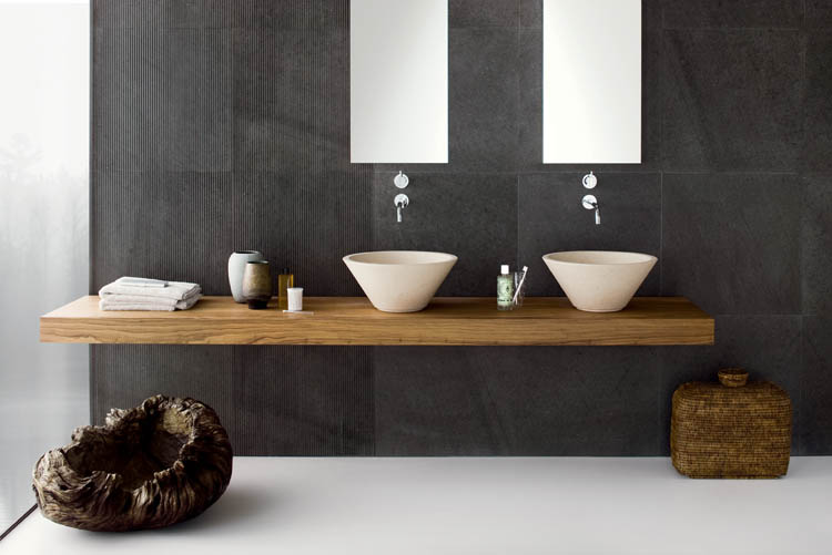 Projektanci Amborgio Nespoli i Alberto Novara lubią proste rozwiązania. Jedyny mebel w tej łazience to solidna drewniana deska pod umywalkami. NEUTRA