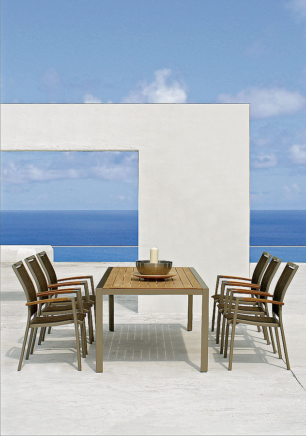 • Przy aluminiowym stole Meridian w cenie 6622 zł fotele Collins z plecionki Sun Loom (odporna i przyjazna w dotyku)