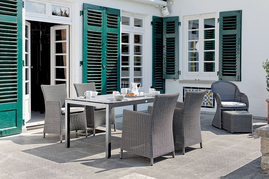 • Przy aluminiowym stole Meridian w cenie 6622 zł fotele Collins z plecionki Sun Loom (odporna i przyjazna w dotyku)