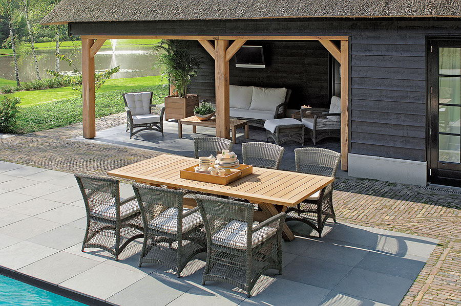• Przy aluminiowym stole Meridian w cenie 6622 zł fotele Collins z plecionki Sun Loom (odporna i przyjazna w dotyku)