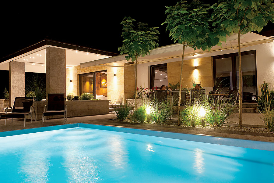 Ciekawie oświetlony letni pokój nad basenem, EUROPOL