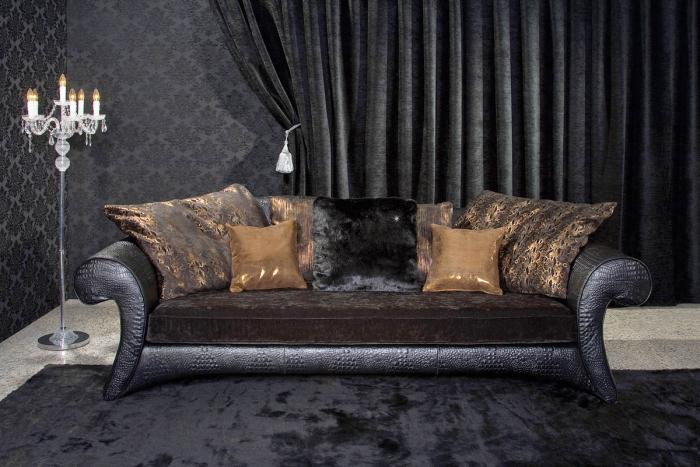 Kanapa Perugia. Podłokietniki ma z tłoczonej skóry bycast przypominającej skórę aligatora, siedzisko i poduszki z połyskującego weluru imitującego skórę węża. Cena - 19 200 zł. MEBELPLAST
