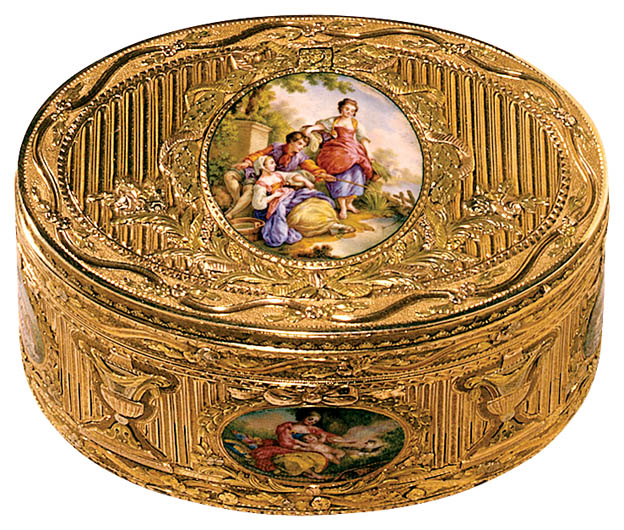 • Pozłacana tabakiera z pozytywką. Na wieczku portret damy namalowany przez rokokową malarkę Rosalbę Carrierę, XVIII
