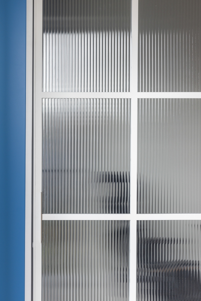 • ryflowana szyba dzieląca domowe biuro i sypialnię