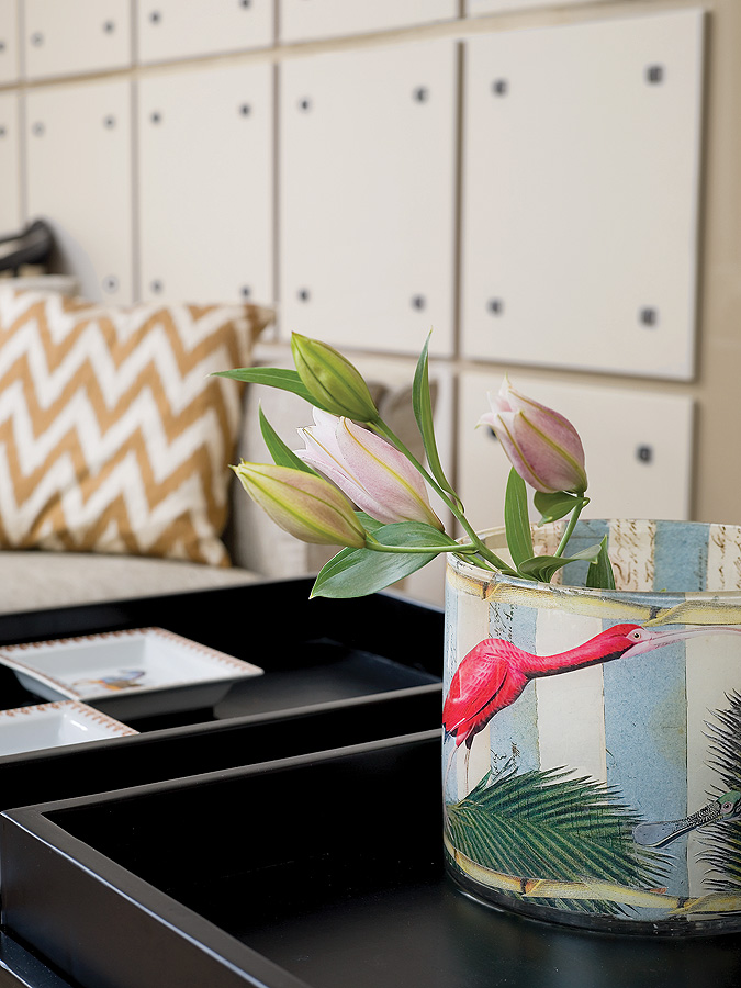 • Za skórzanymi kwadratami kryje się pokaźna szafa.