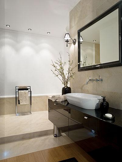 • Prosto, ale elegancko, dużo szlachetnego kamienia – marmurów, trawertynów, granitów.