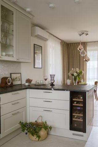 Eleganckie połączenie beżu i szarości otula łagodnie ten luksusowy nadmorski apartament. Stonowaną paletę przełamują odcienie błękitów, ożywają faktury tkanin i struktury materiałów wykończeniowych.