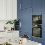 • biała kuchnia z niebieskimi szafkami