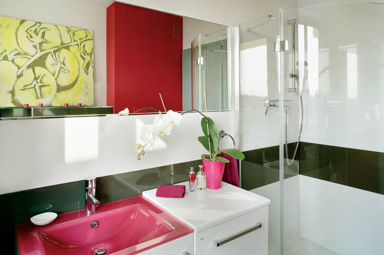 • Meble i płytki są biale. Jedyne ekstrawagancje to purpurowa umywalka i kolejny obraz z seriii żółte pomidory.
