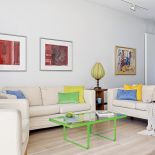 • Ciepłym kolorom wnętrz przeciwstawia się eksplozja barw z wiszących na ścianach obrazów. Prawie wszystkie namalował