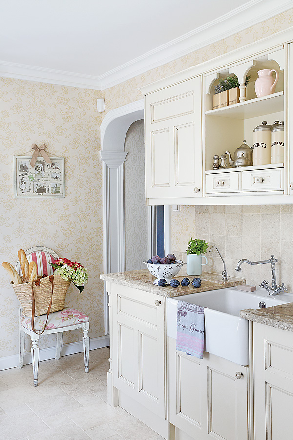 Drewniane bielone meble z delikatnymi przecierkami i piec marki La Cornue ze srebrno-miedzianymi dodatkami z