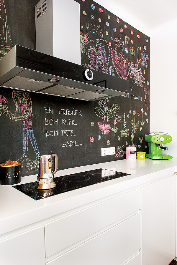 Szafki zrobione z matowego mdf-u, do tego biały blat z korianu. Dla kontrastu, czarna ściana pomalowana farbą tablicową.