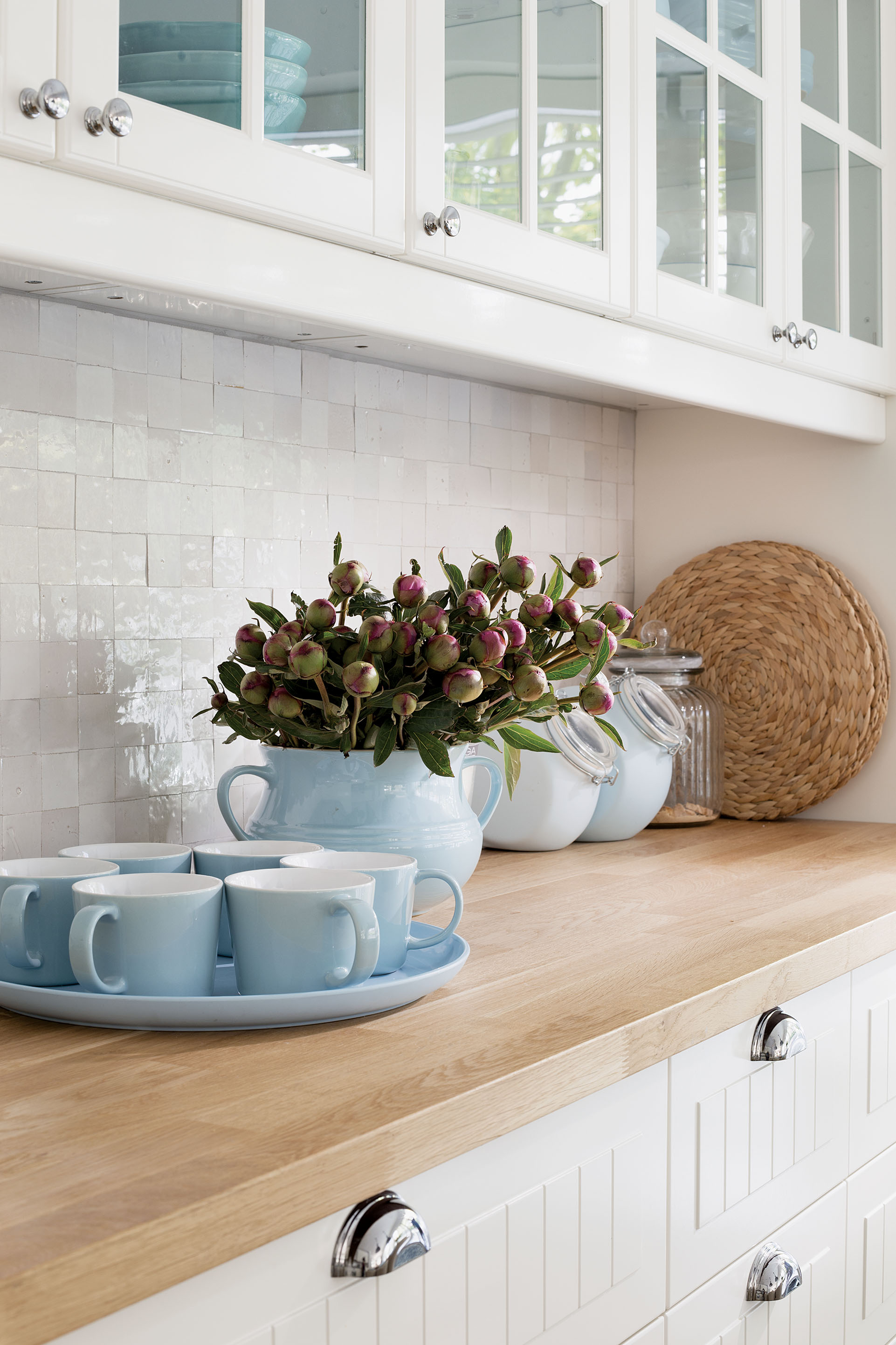 biała kuchnia z niebieskimi dodatkami
