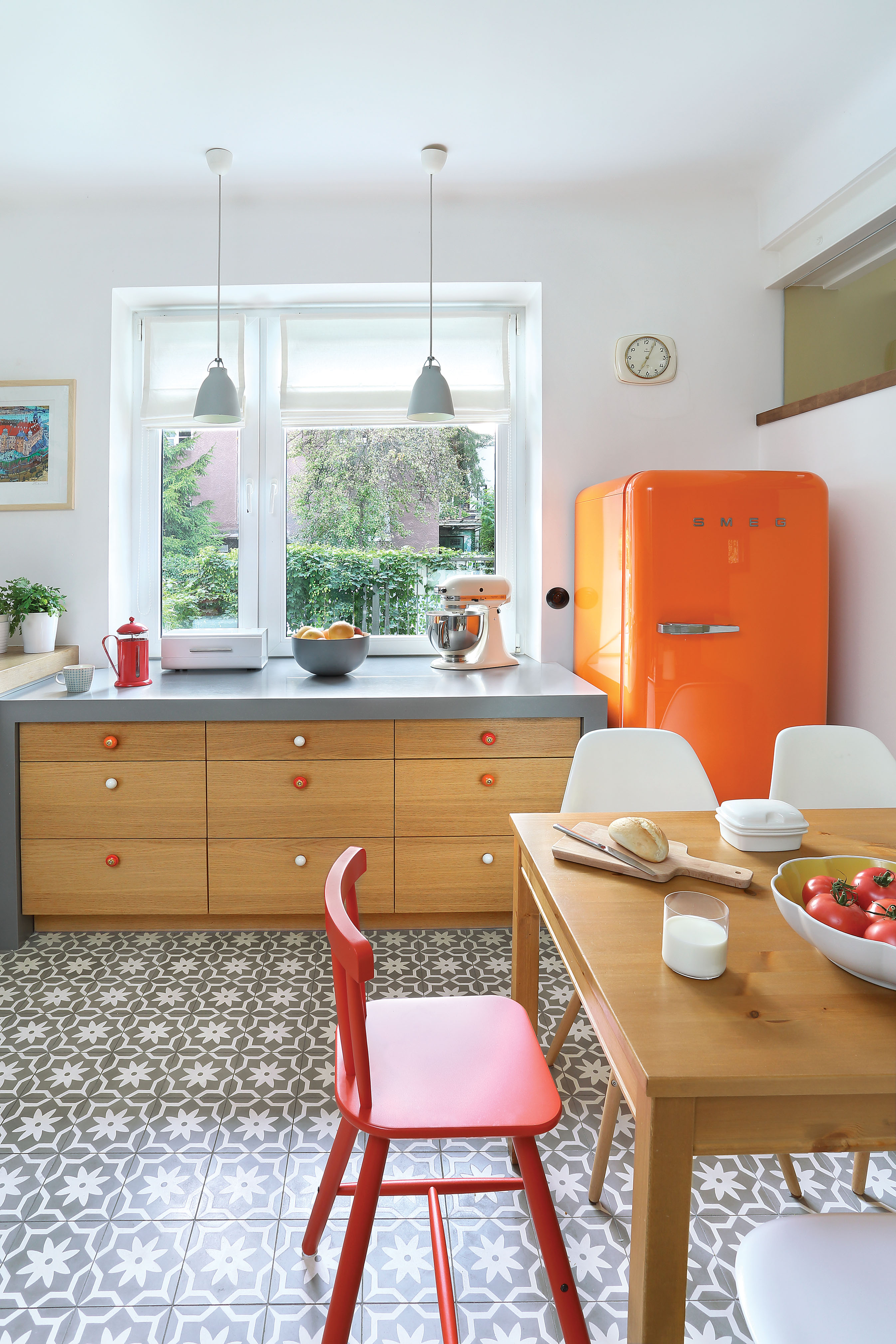 Co do kuchni, właściciele wiedzieli tylko, że muszą kupić lodówkę retro. Klimat podkreślają stylowe włączniki