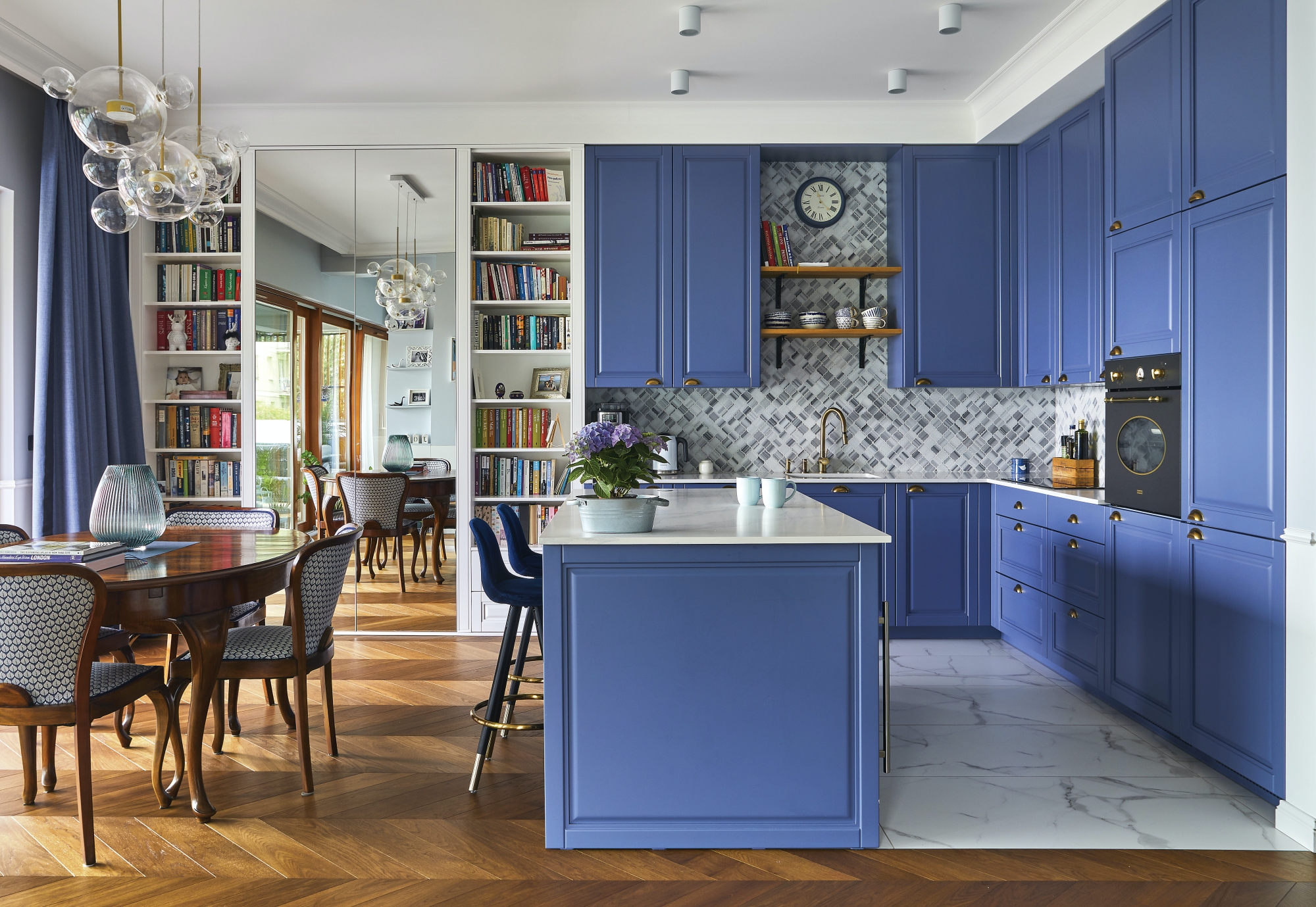 Olga i Tomasz chcieli mieć dużo amerykańskich detali we wnętrzu – od sztukaterii, przez uchwyty muszelki po złote akcenty. Oraz kolor niebieski, obowiązkowy w stylu nowojorskim i hamptons.