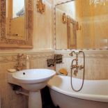 • Ła­zien­ka w ko­lo­rze zsza­rzałe­go różu, wyłożo­na ja­snym tra­wer­ty­nem Bot­ti­ci­no i Ros­so Ve­ro­na, z