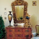 • Intarsjowana wieloma gatunkami drewna ogromna szafa z lustrem i empirowe łoże z ozdobione czeczotem i złoceniami.