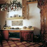 • Stylizowane na stare komody szafki kuchenne przykryto kamiennym blatem. Gzyms komina jest z piaskowca.