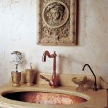 • Zlew i armaturę wykonano na zamowienie z miedzi młotkowanej w piasku.