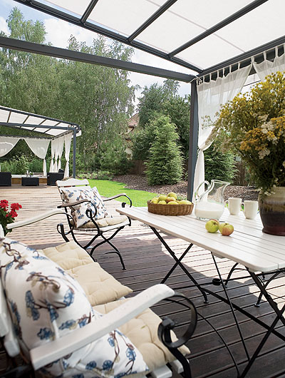 • Białe tkaniny pozwalaja poczuć się jak na południu Europy.