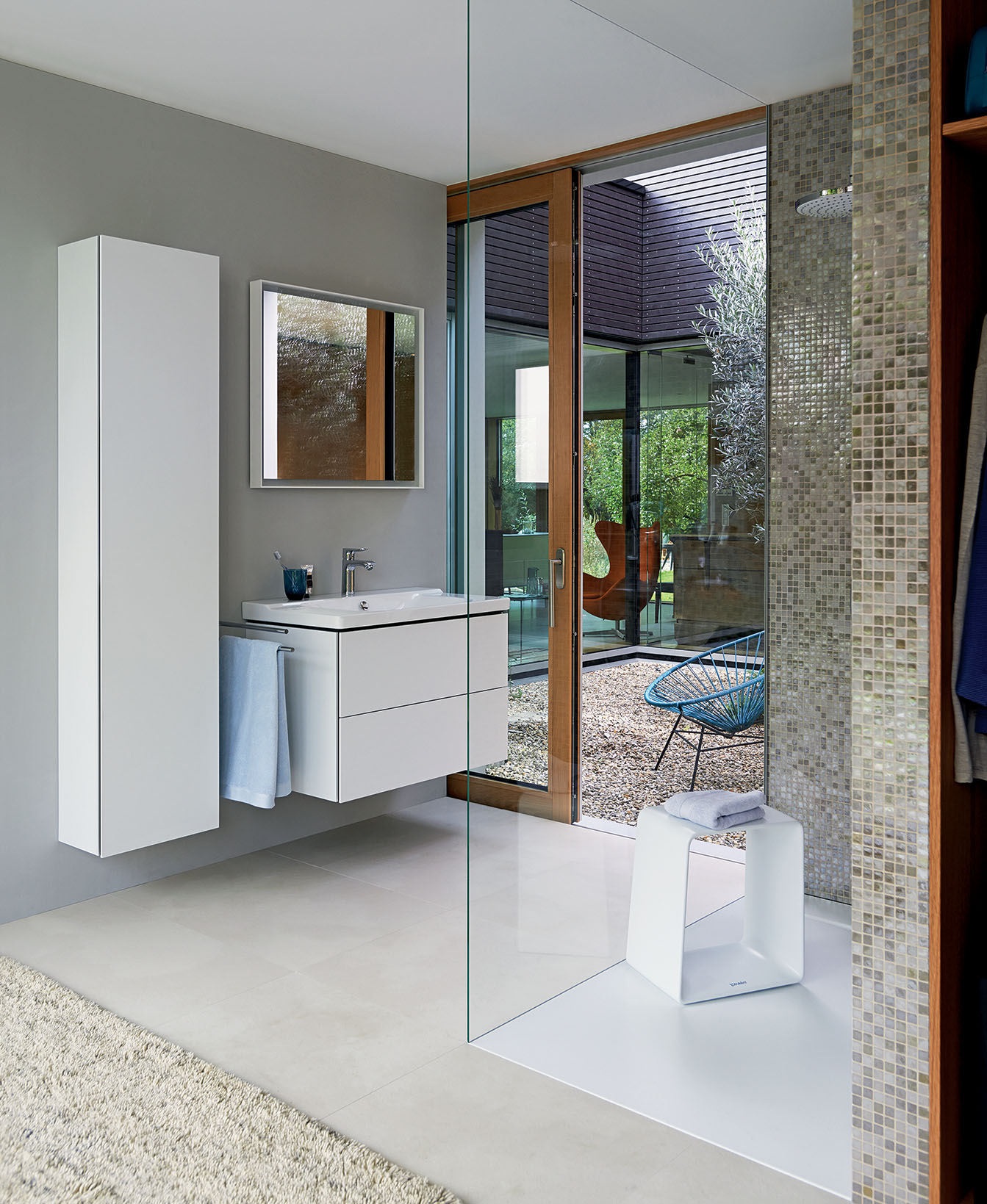 P3 COMFORTS, brodzik montowany na równi z podłogą, do tego kabina prysznicowa Open Space i stołek pod prysznic odporny na wodę, DURAVIT, duravit.p