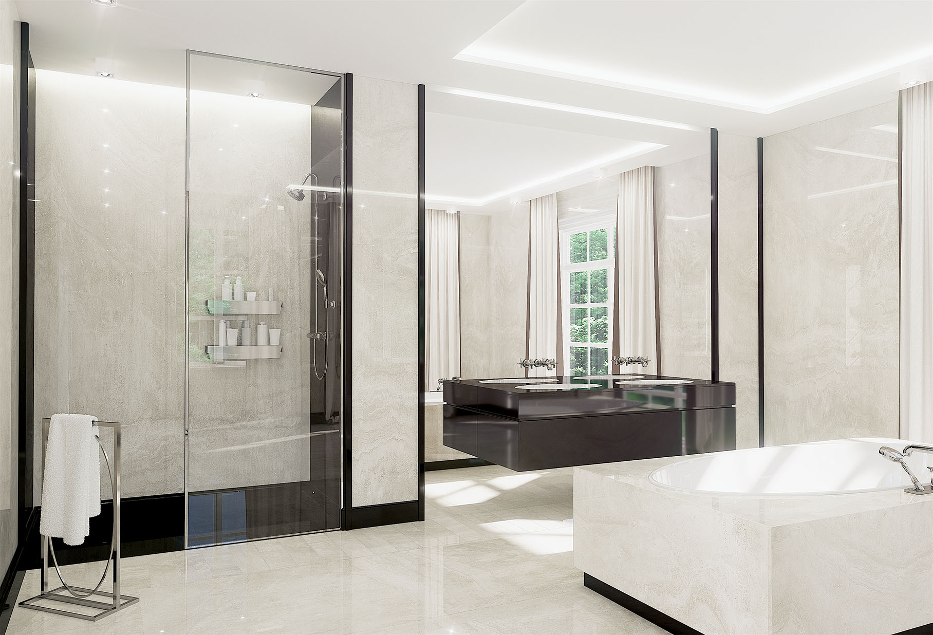 CREMA VENEZIANA, łazienka wykończona bardzo twardym marmurem z pięknym rysunkiem, kamień pochodzi z Marmo di Orosei na Sardynii, INTERSTONE, interstone.pl