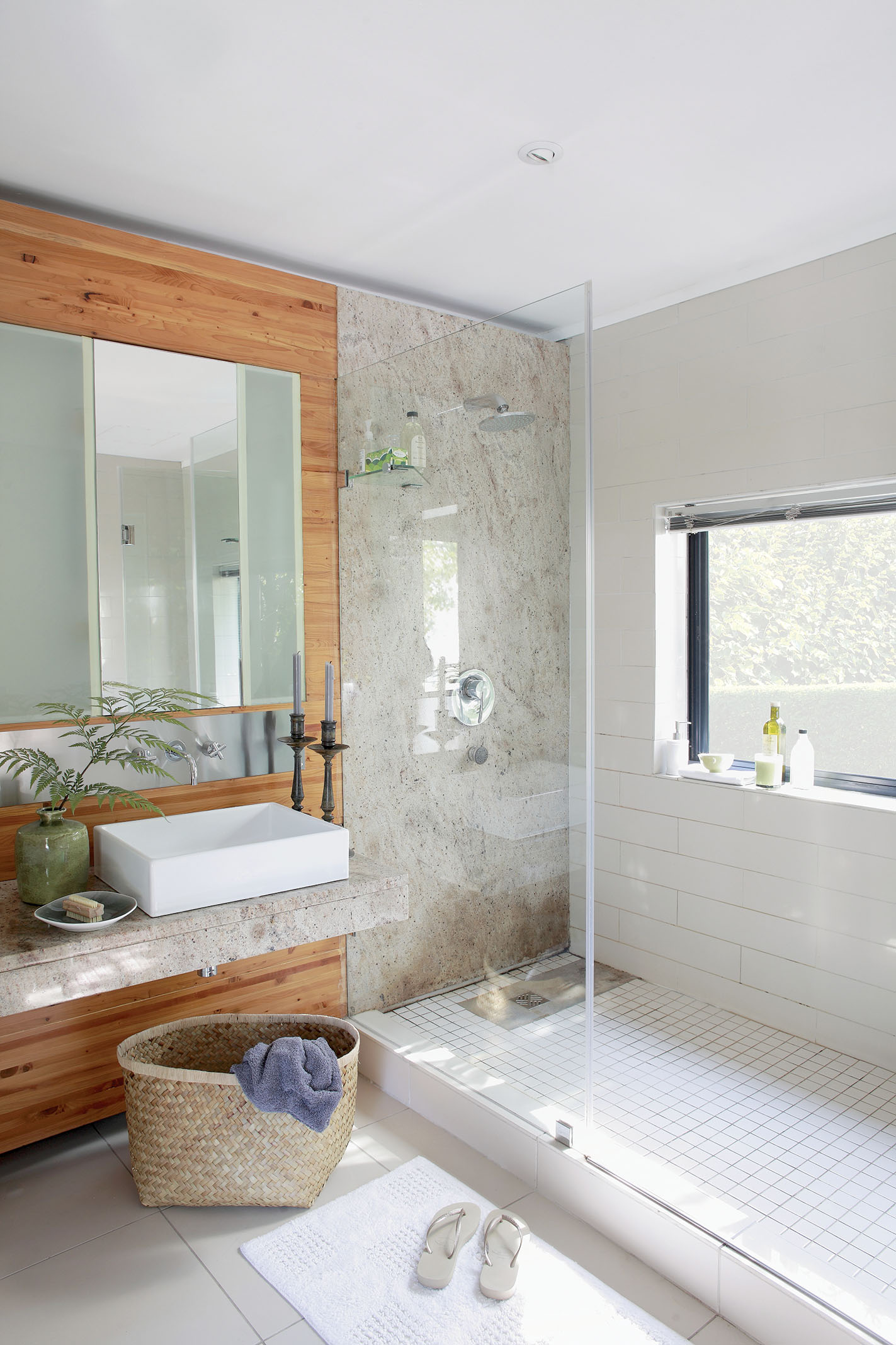 • CIEKAWE ŁĄCZENIA, pod prysznicem zastosowano dwa rodzaje płytek i kamień.