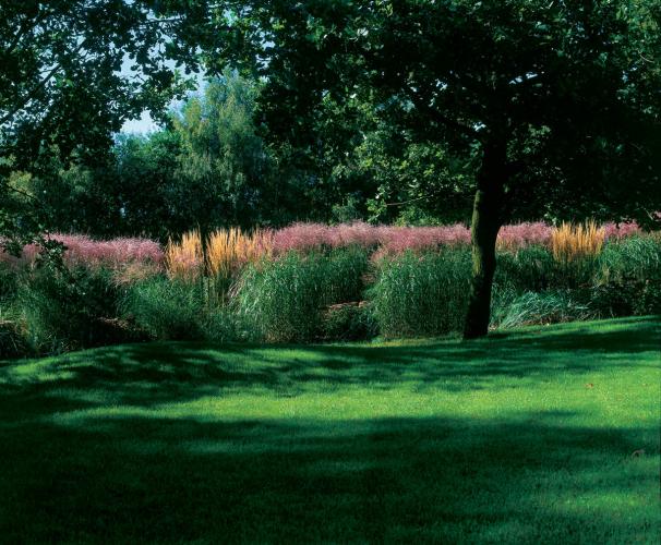 • Kolorowe trawy w ogrodzie. Nad rzeczką, pośród traw