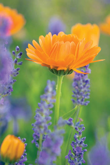 Nagietki pięknie wyglądają, zwłaszcza w większej grupie, zestawione z roślinami o niebieskich lub fioletowych kwiatach