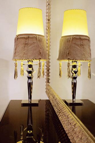 • Isotta z kolekcji Visionnaire firmy Ipe Cavalli. Podstawa stalowa, abażur obszyty futrem i wykończony