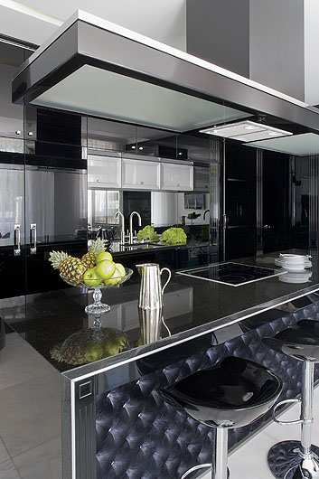 Aksamit pojawia się w zaskakującym miejscu: na wyspie kuchennej. Wysadzany jest kryształkami i dżetami. Prawdziwy glamour.