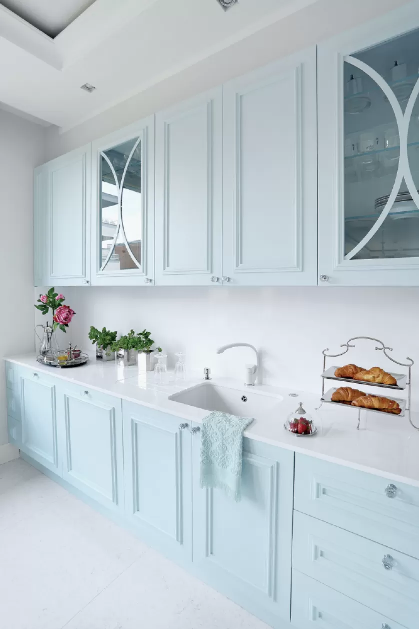 Delikatny baby blue i klasyczna biel rozświetlają kuchnię i wnoszą sporo świeżości, projekt: Patrycja Orzepowska Decor Living Home, zdjęcie: Aneta Tryczyńska, stylizacja: Katarzyna Sawicka