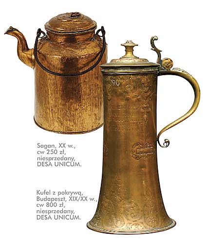 • Brytfanna z dworskiej kuchni. Dzban miedziany, Rosja, 1853 r., cs 750 zł, Rempex. Pojemnik na lód, ok. 1910 r.,