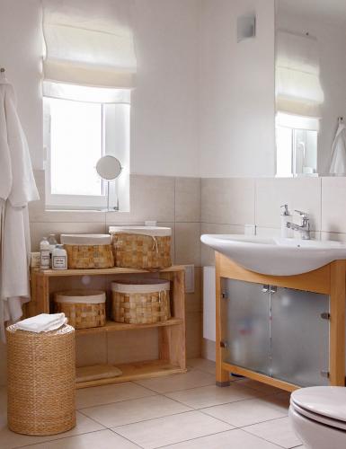 Tak niewiele potrzeba, aby było przytulnie. Plecione kosze wyściełane białym płótnem są dekoracyjne i bardzo praktyczne.