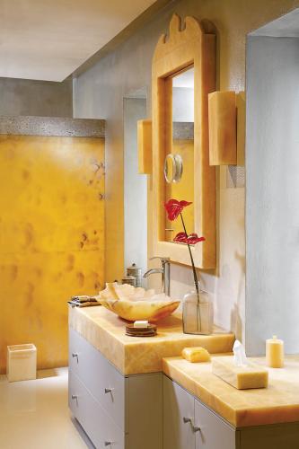 Ściany z surowego betonu ocieplił miodowy onyks. Każdy jego element jest podświetlany. Podłoga prysznica wyłożona