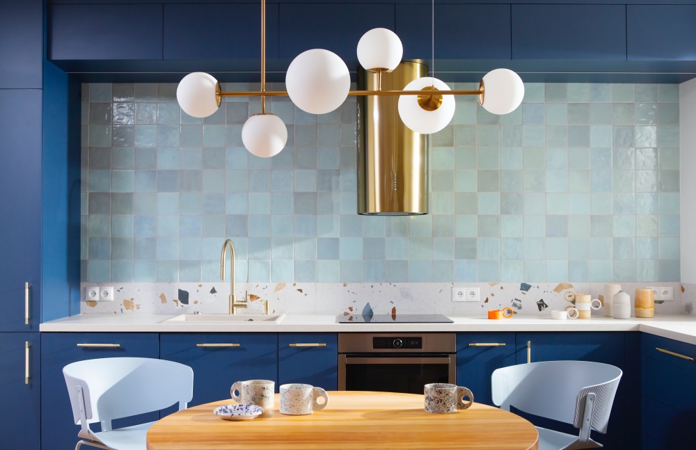 niebieskie szafki kuchenne w mieszkaniu