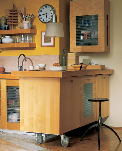 • Pod sufitem kuchni zamiast wiszącej lampy rozpostarta jest tkanina, przez którą prześwieca łagodnie światło. To