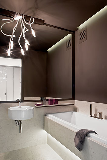 • Szarość i odcienie oberżyny. Do tego podświetlenia przy suficie i pod wanną tworzą kosmiczny klimat.