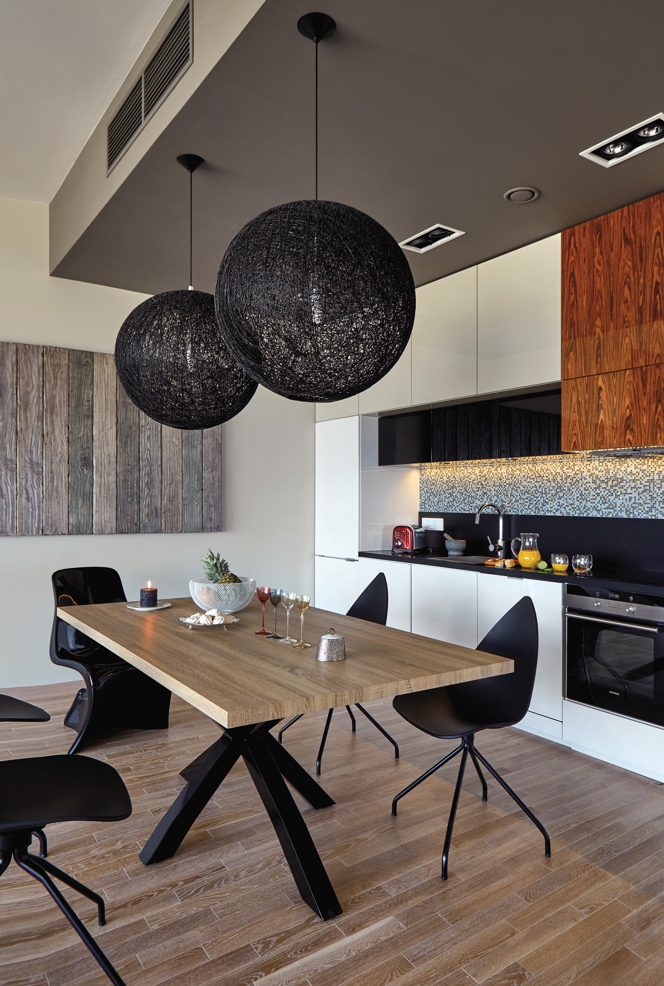 • Rozbielone deski na podłodze i blacie stołu zagrały z drewnianą okładziną na ścianie w nieoczywistych kolorach.