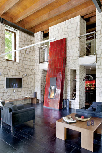 Na ścianach zastosowano łupek wapienny wydobywany w Bochotnicy.