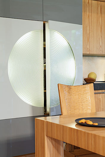 • Motyw koła pojawia się na podświetlanej tafli szkła na froncie kuchennej szafy.