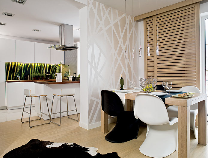 Bambusowe motywy. Nad blatem laminowana grafika w szkle, na ścianie wzór naśladujący układ łodyg. Perłowy