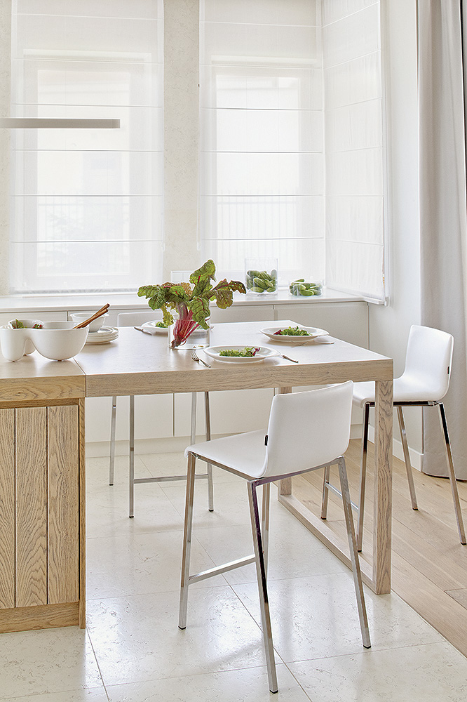 Na podłodze leży wapień perlino bianco. Matowe szafki zestawiono z wyspą-stołem z szarzonego dębu. Sprzęt