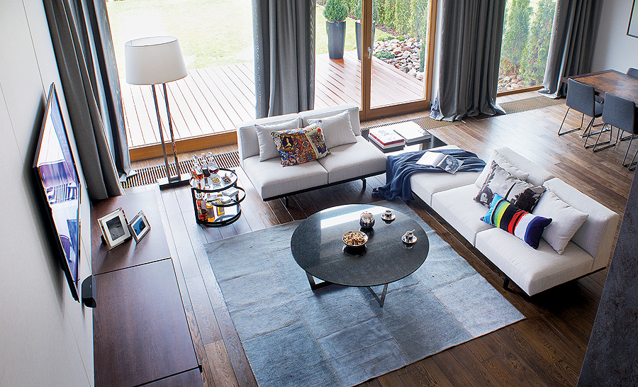 Podłoga z barwionego dębu to dzieło firmy Nelo-One. Kanapy na zamówienie - Zwara. Poduszki i dywan - Decodore Basic.