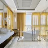 Takie widoki zobowiązują. Nowoczesny, luksusowy apartament został więc urządzony tak, żeby nic ich nie zasłaniało. Tutaj nawet w kąpieli można podziwiać warszawski świt!