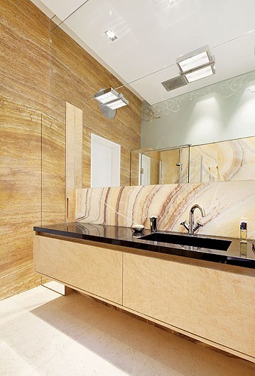• W łazinkach królują trawertyn i onyks oraz szkło.