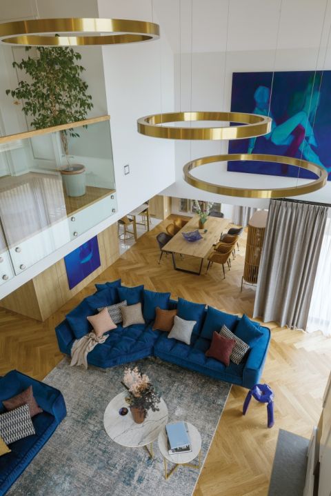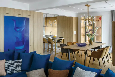 Nowoczesny dom pod Wrocławiem – drewno dodaje mu przytulności, a mocny granatowy akcent ciekawie ożywia wnętrze